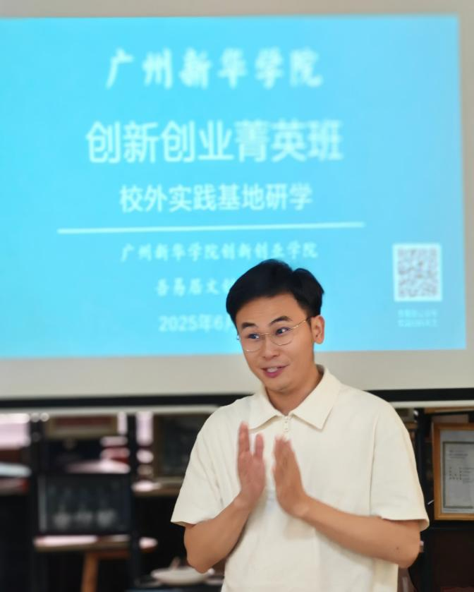 端午小长假的最后一天,即2025年6月2日下午,当大多数人都还在享受着假期的惬意时光之时,太阳成集团tyc33455创新创业菁英班(广州校区)的同学们在创新创业学院杨宇帆副院长和李爱延老师的带领下,选择了一种更酷的享受方式,他们汇聚于一处充满时光印记的宝藏地—百年骑楼“吾易居”文创空间,开启了一场别开生面的跨界研学之旅。