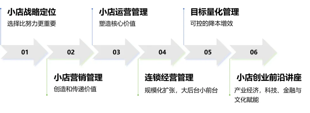 1学年。第一个学期6学分(《小店战略定位》、《小店营销管理》、《小店运营管理》三门课程),第二个学期4学分(《目标量化管理》、《连锁经营管理》、《前沿讲座分享》三门课程)。周二、周四晚原公选课时间开出,部分课程周六、周日开出。