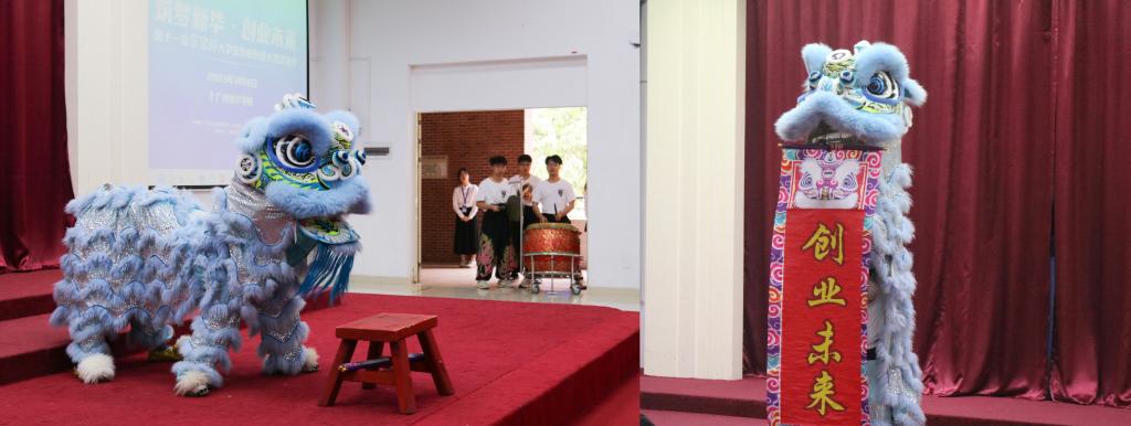 决赛初始,学校艺术团醒狮队鸣鼓开锣,敲响比赛战鼓,并为参赛团队送来“筑梦新华 创业未来”的美好祝愿。