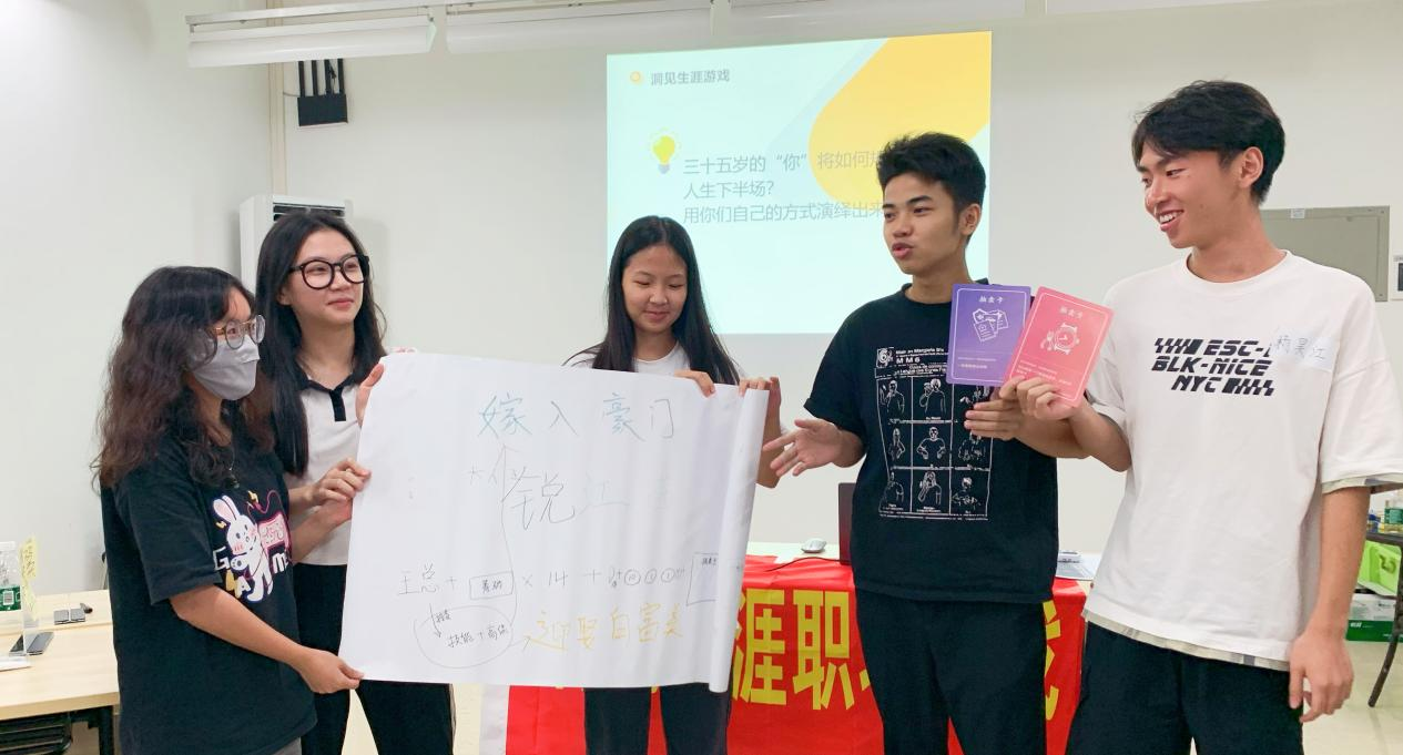 在游戏过程中,学生模拟职业未来,提前把握人生方向。在短短4小时内,学生们经历了出生、青葱岁月(20岁之前的美好时光)、燃情岁月(初入职场的前十年)、峥嵘岁月(职场的后二十五年)和大结局(退休生活)。面对游戏中出现的各种状况,学生纷纷各出奇招:“出生家境”略差的小组努力挣脱不利的境地,找准并捉住机遇,改变人生;“出生家境”优越的小组谨慎抉择,合理分配财富,成为了全班公认的“王总”、“魏总”,并一直站到最后;“出生家境”普通的小组对自己普普通通的一生十分满足,一路追求安稳。通过这次洞察生涯职场游戏,有些同学对友情有了更加深刻的理解;有人认为人生不是一场定局,有时选择比努力更加重要;有人认识到亲情、健康胜于一切;有人透过游戏,更加明晰了自己的目标....