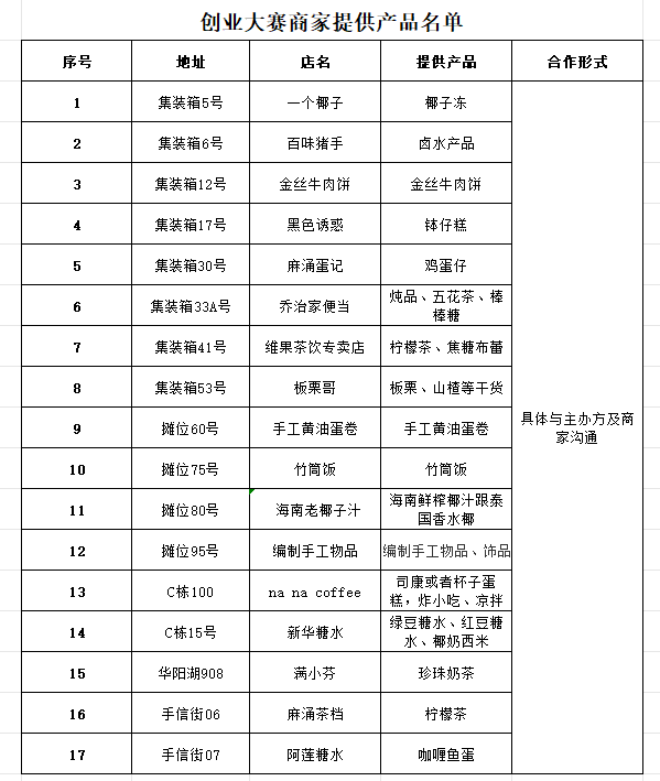 创业大赛商家提供产品名单: